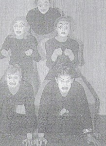 Několik členů pantomimického kroužku ,,Pankreon" (zleva dole F. Novák, S. Zíka, E. Janotová, B. Zíková, nahoře B. Pfefferová
